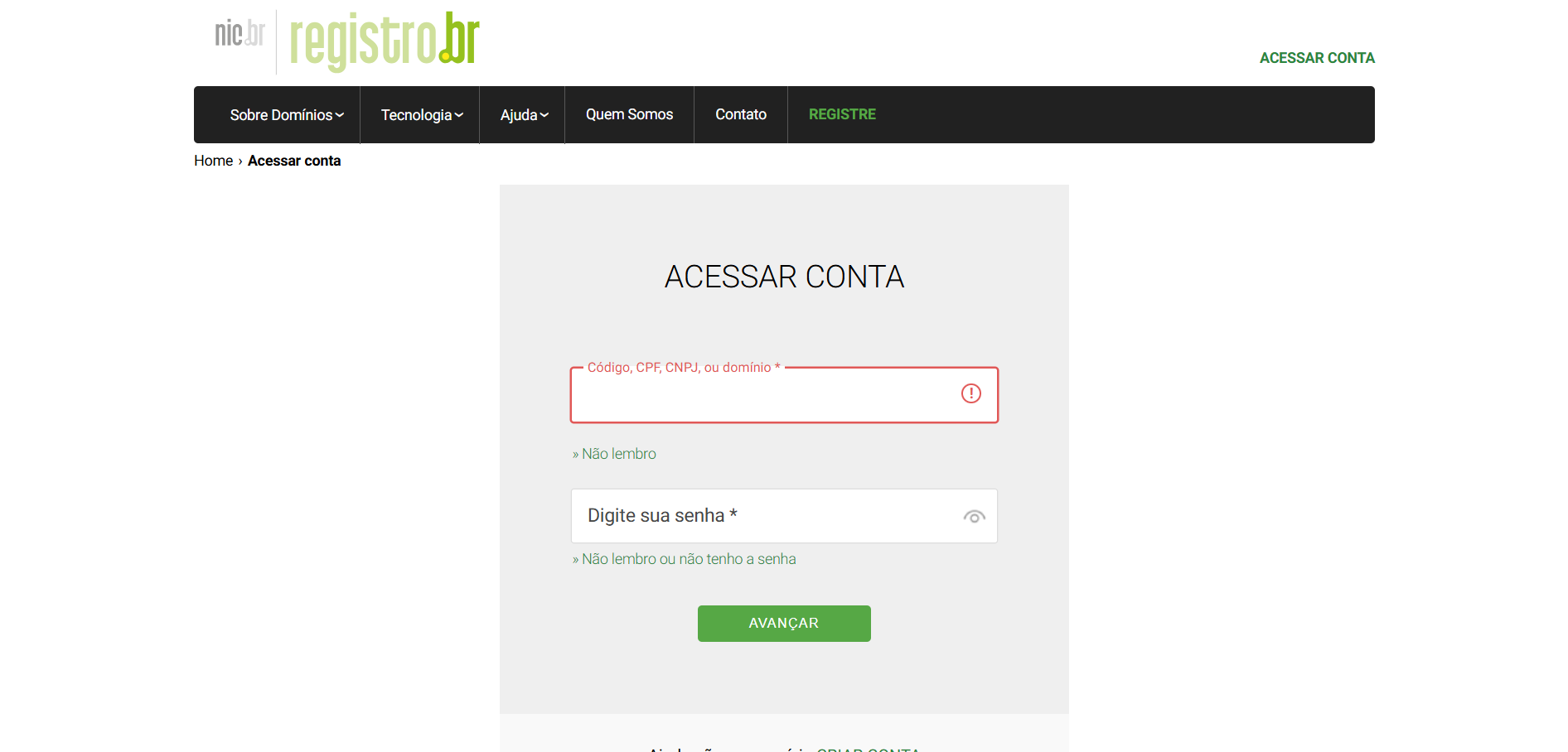 Vá até o site registro.br e clique em Acessar Conta. Insira seu usuário (CPF/CNPJ ou ID) e sua senha