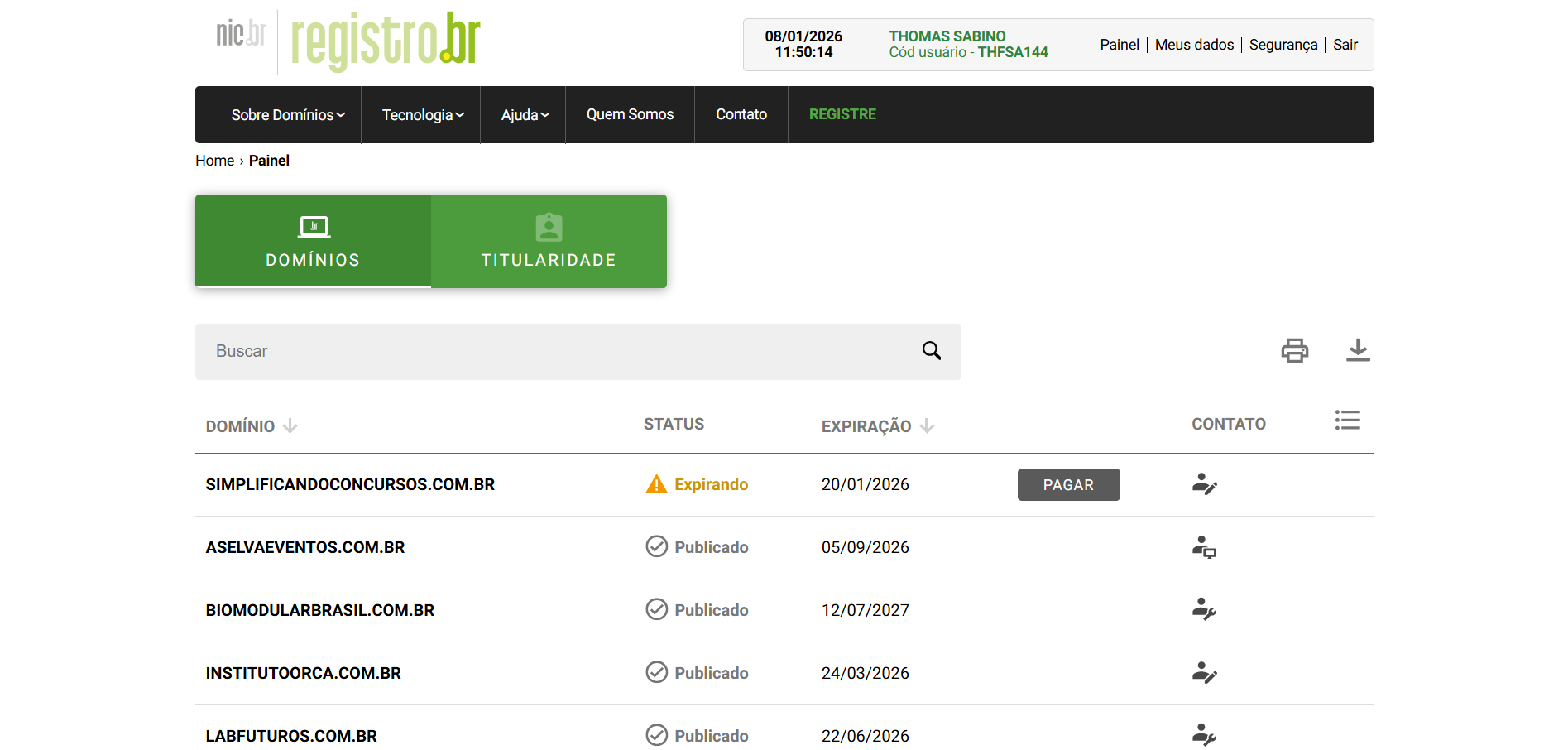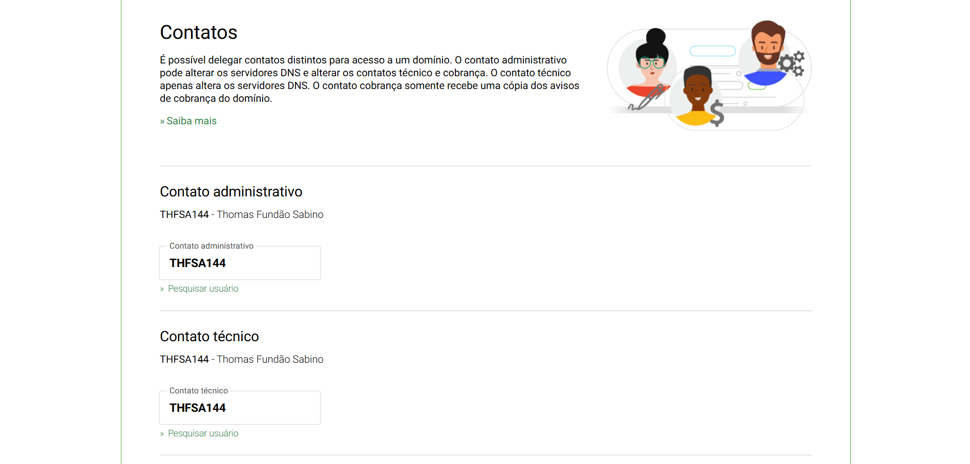 No portal Registro.br, existem diferentes níveis de responsabilidade. Ao nos colocar como Contato Técnico (ID: THFSA144), você nos dá permissão apenas para configurar os servidores onde o site ficará hospedado.